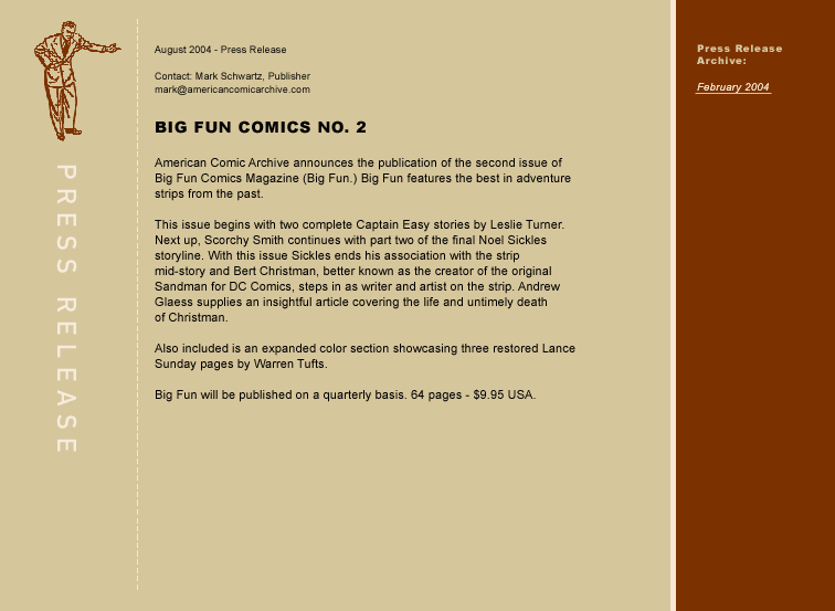 American Comic Archive Publisher of Big Fun Comics Magazine, a collection of classic american adventure strips, Captain Easy, Wash Tubbs, Scorchy Smith, Frank Robbins artwork, Lance, featuring artwork by Americas top comic artists, classic comic strips Roy Crane, Leslie Turner, Noel Sickles, Bert Christman, Frank Robbins, Captain Easy, Wash Tubbs, Scorchy Smith, Johnny Hazard, Lance, Warren Tufts, Casey Ruggles, Rick OShay, Stan Lynde, Mel Graff, Milt Caniff, Terry and the Pirates, newspaper comic strips, Little Orphan Annie, Leonard Starr, Dick Tracy, Flash Gordon, Adventures of Patsy, Buz Sawyer, Steve Canyon, Prince Valiant, Hal Foster, similar to Comics Revue, reprint of newspaper strips from golden age. | |